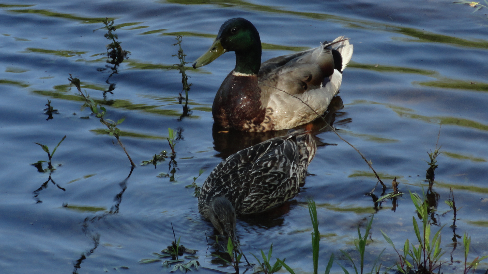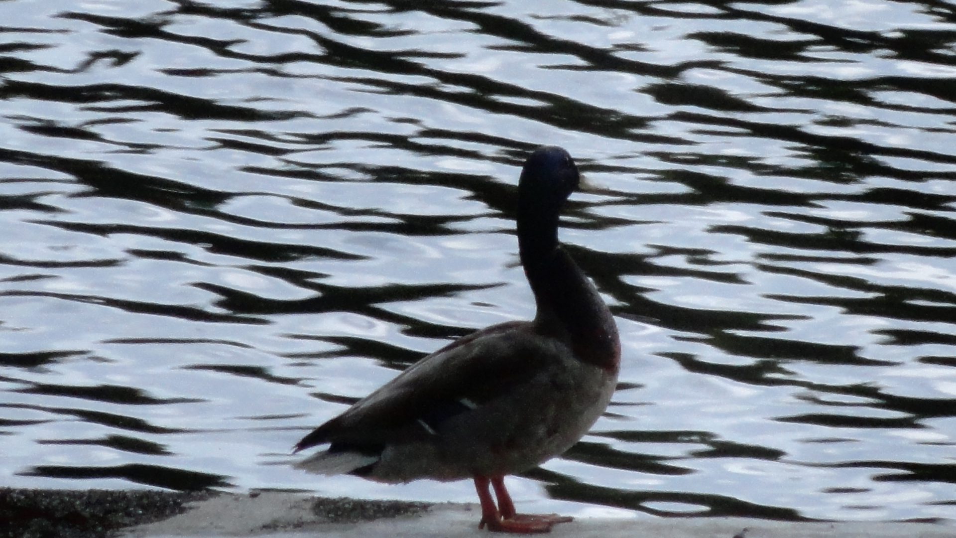 When it gets hot, and ducks get bored, the drama begins. My beach became a scene from West Side Story. Three drakes arrived while Daddy and Mama were snoozing. Daddy woke with a start and immediately went at two of the intruders. The third drake moved past the fighting to put some moves on Mama. She responded with indignant anger but he wasn’t fazed in the least. Mama took off up river, with the offender hot on her tail. I could still hear them, long after they were out of sight. Seeing their buddy chasing Mama, the other two ruffians decided to follow suit. Daddy was left with fewer feathers and a slight limp. But Mama was gone. Quacking softly, Daddy waited on the beach until dusk. Still no Mama. Around 8:00, he waddled onto the retaining wall until well after dark. Every so often he would quack softly. While at my desk, I could hear him. Convinced he was calling for his mate, my heart ached for his longing.