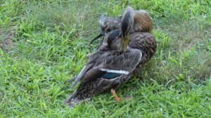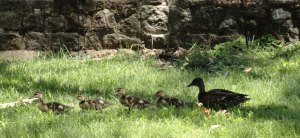 Sadly, however, we didn’t get a long visit. Another hen with fourteen (OMG!!) ducklings came into the yard. Older than Mama’s chicks, the ducklings hadn’t been taught acceptable playground behavior. Running around like sugared-up kids, one of them started chasing Mama’s chicks. Acting like a water fowl version of Angelina Jolie in Tomb Raider, Mama soon put the duckling in his place. Who knew Mama could move with such speed?