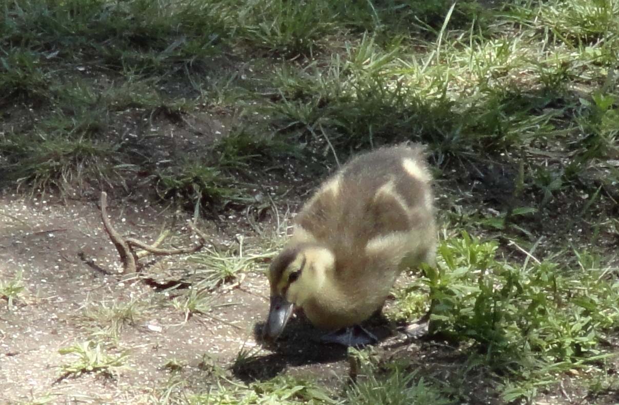 Yup, she finally did it! After waiting and waiting, Mama finally laid her eggs and stopped by a few days ago with ducklings in a row. Four chicks and a proud Mama walked onto the lawn while I was having my morning coffee. They probably heard me up in Lowell as I rushed into Chris’ bedroom. “Mama is here and she has babies with her!!! Come on!!” Ahh, it’s easy being 19, all you have to do is tell your mother to get a life, roll over, and go back to sleep. His lack of enthusiasm didn’t faze me in the least though. Grabbing the camera, I headed outside for some family photos. Chirping and squeaking, four little balls of yellow fluff were pecking the ground, never straying too far from Mama. She kept a watchful eye, just like Daddy used to stand watch while she ate.