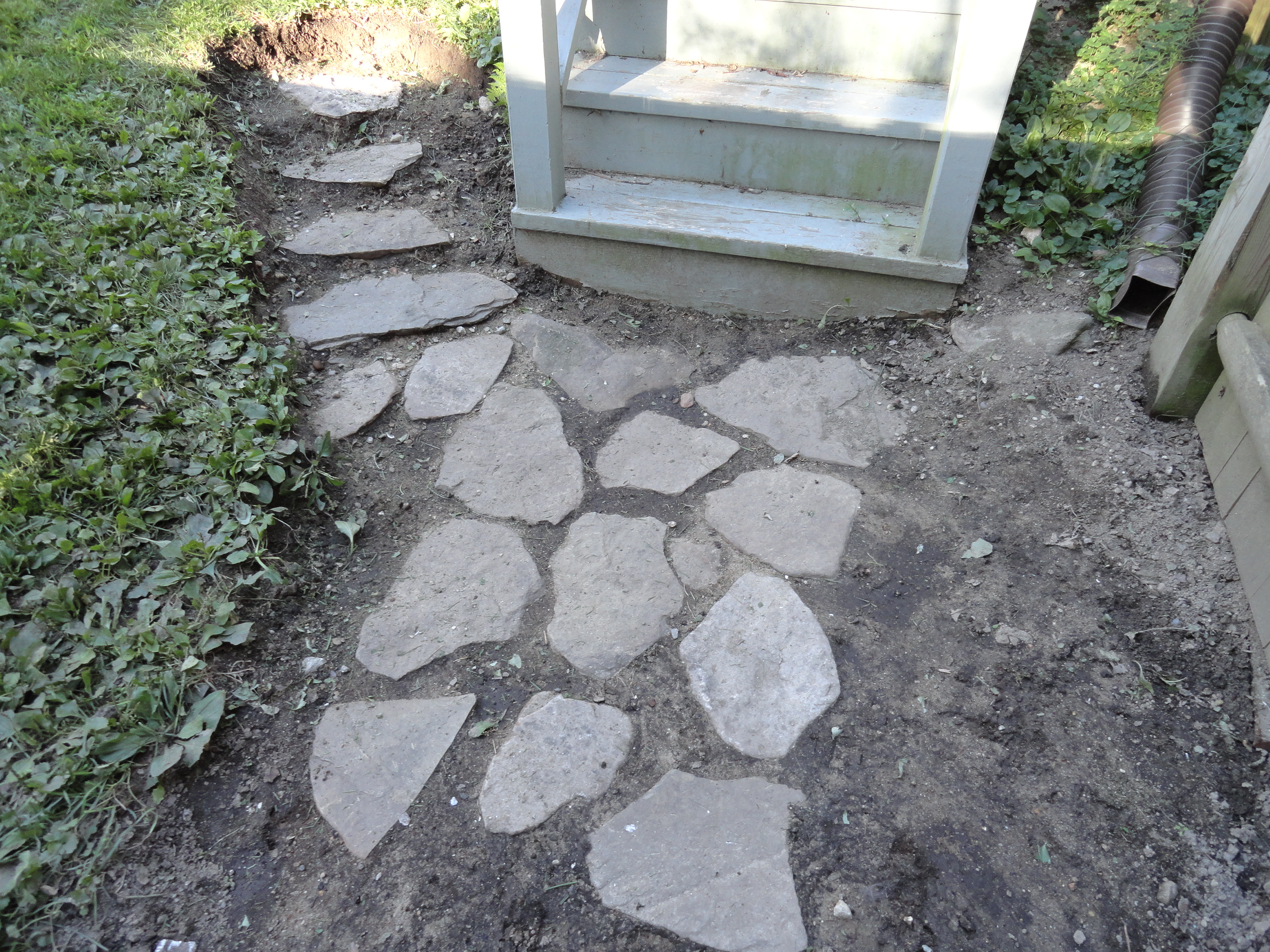 i installed the flagstone 1997 or thereabouts. when we bought the house the septic system had to be raised, which is why there is an ugly hole in the lawn near the driveway, to compensate for the hill. the town morons made us dig the giant hole, had to cut down a giant tree..made no sense to me, but we did like the hill because it gave us some dry land. when my ex sold the house they had to connect to sewer so i imagine thats when they dug up the hill again and buried my flagstone. we also put up the fence so the coyotes wouldn’t eat my little dog.