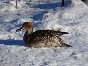 Dabblers like Mallards, Pintails live in similar environments and eat similar food — in this case Cheerios and cracked corn. They’ve been with the flock for over a week and don’t appear to have any interest in moving on. Perhaps they’ll stay and nest come Spring. That would be way cool!