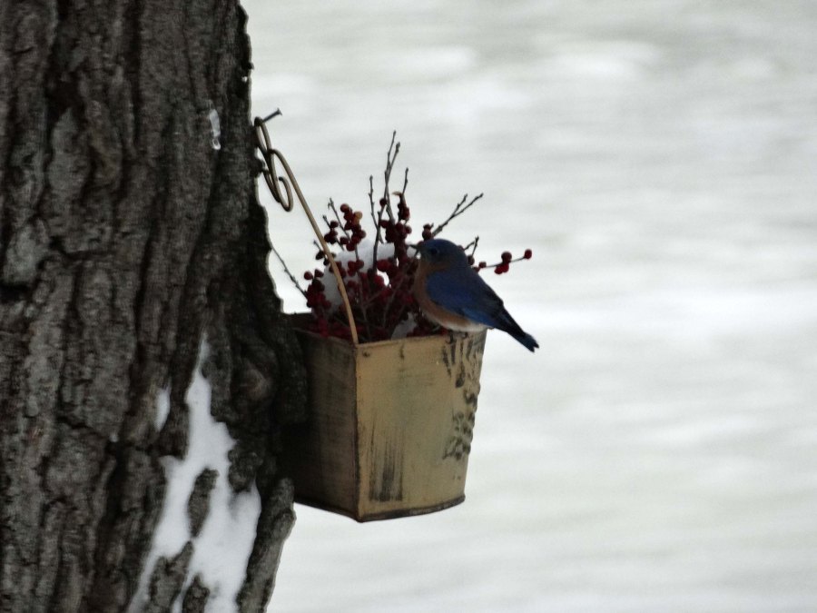 bluebird in flower box