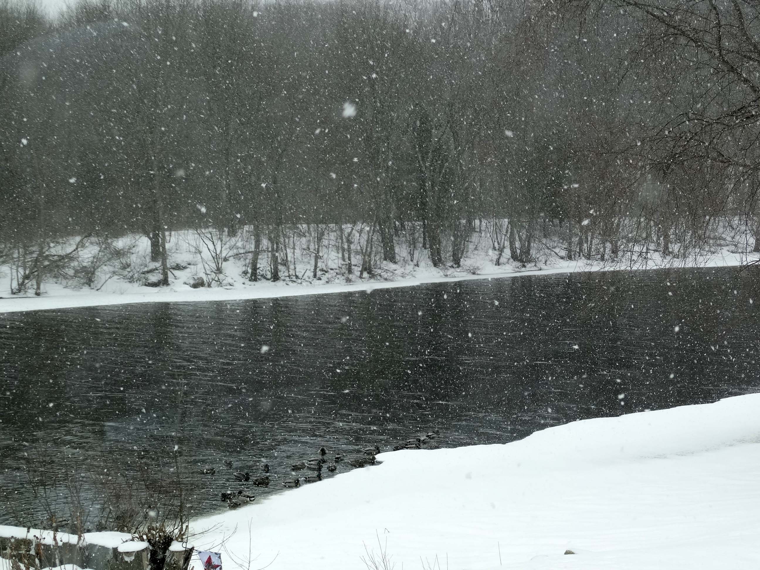 Snowing, again, on the Concord River.