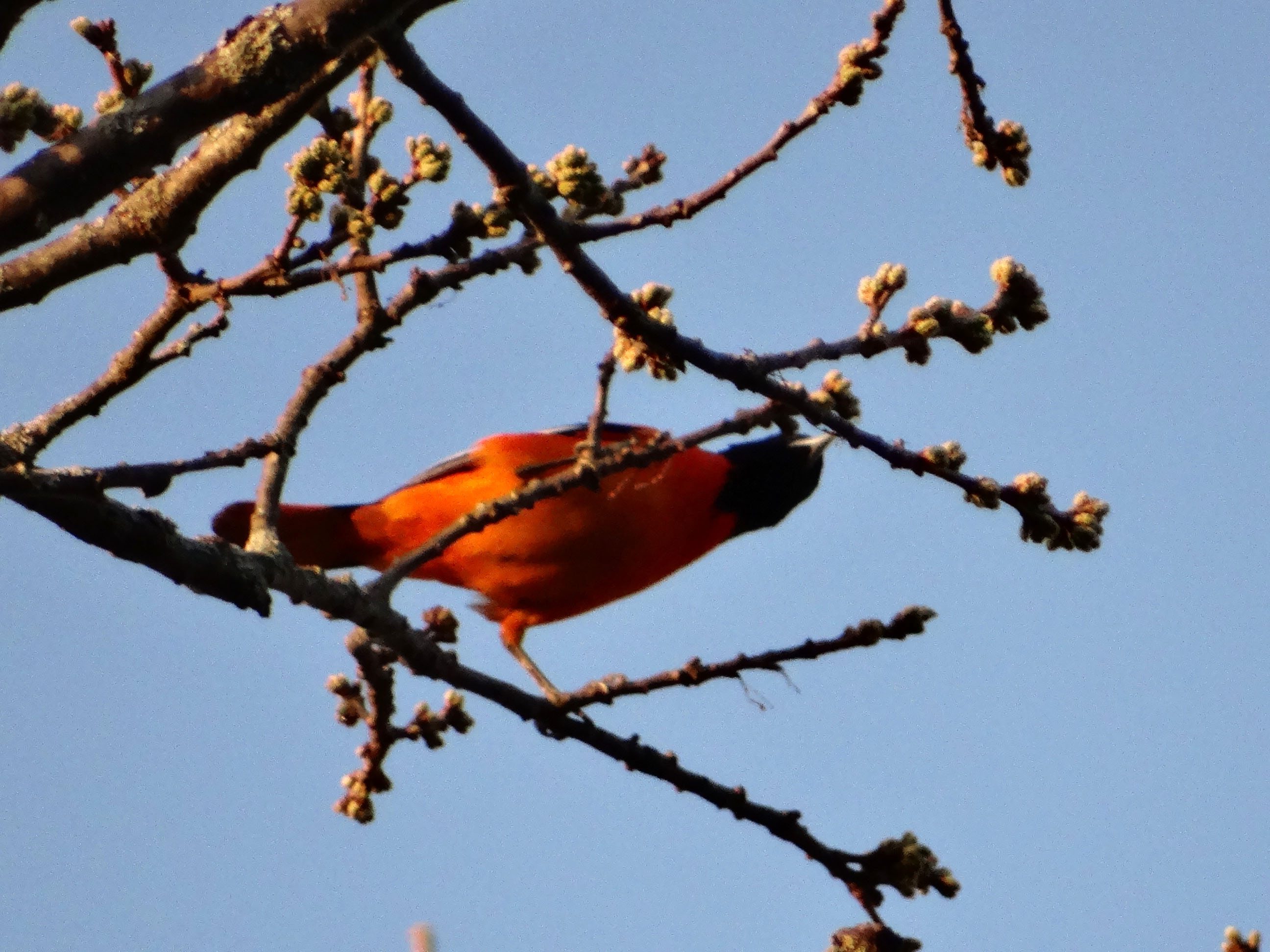 Orioles don’t reuse old nests but they typically recycle the materials. The nest from last year’s pair is still hanging over the side yard and a male has been inspecting it. Many times orioles will build a new nest right alongside an old one. It’s the females who do the weaving (sexist birds), so I’m just going to have to be patient, since I haven’t seen a female yet.
