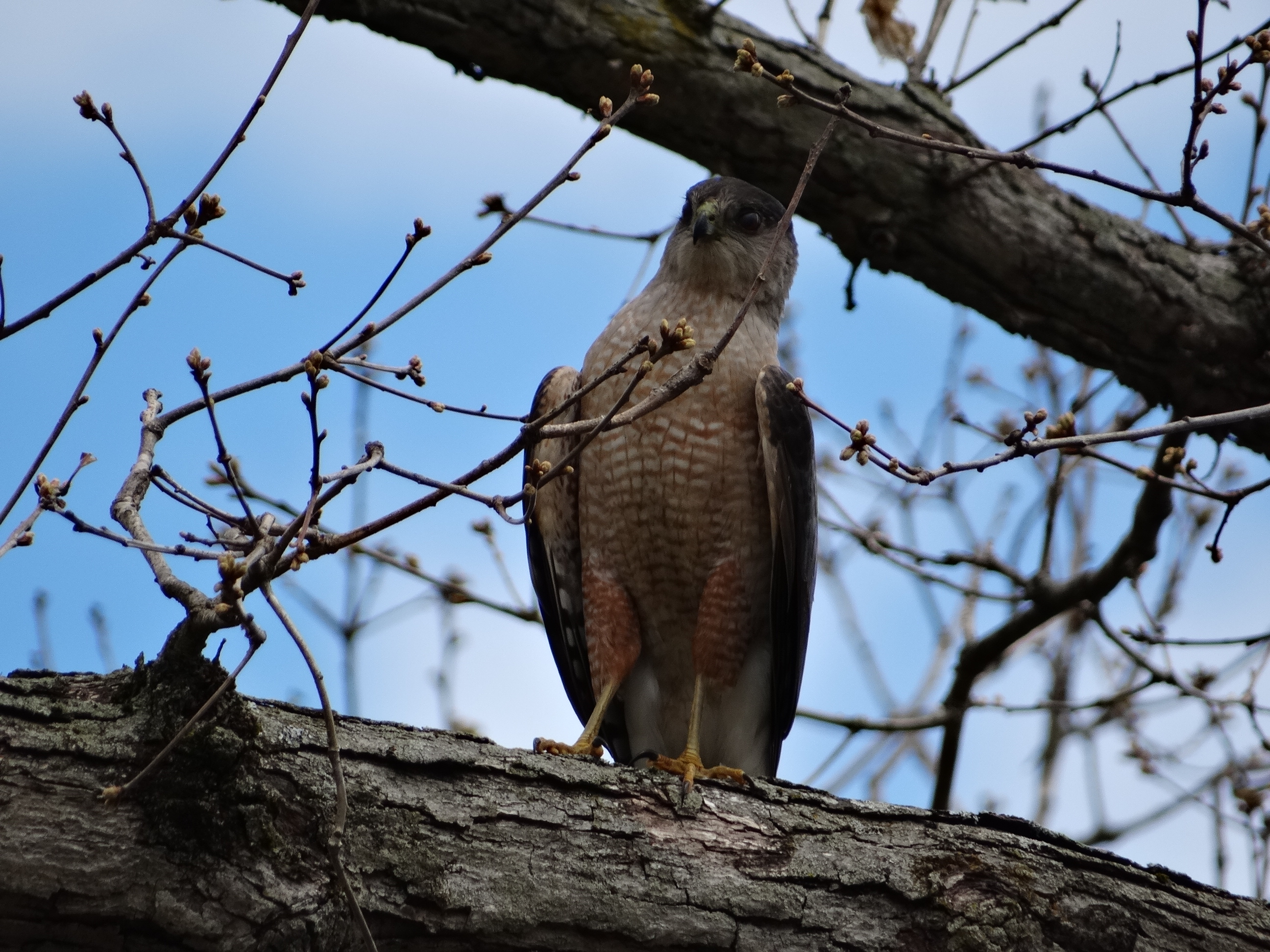 Cooper’s hawks have been known to hang around bird feeders, looking for quick meals. Anytime this hawk wants to visit my feeder and chomp on a few house sparrows, he doesn’t even have to call first!