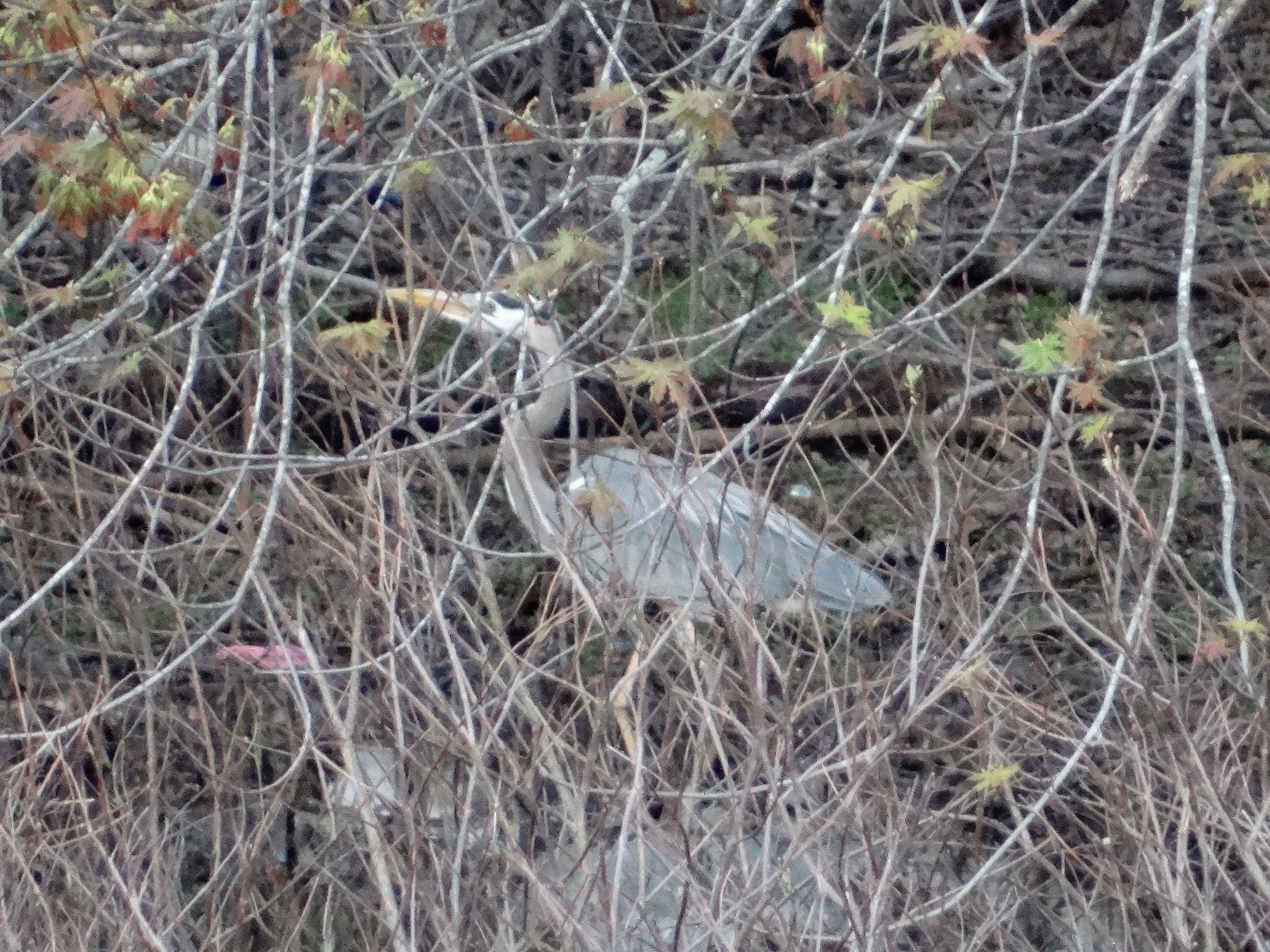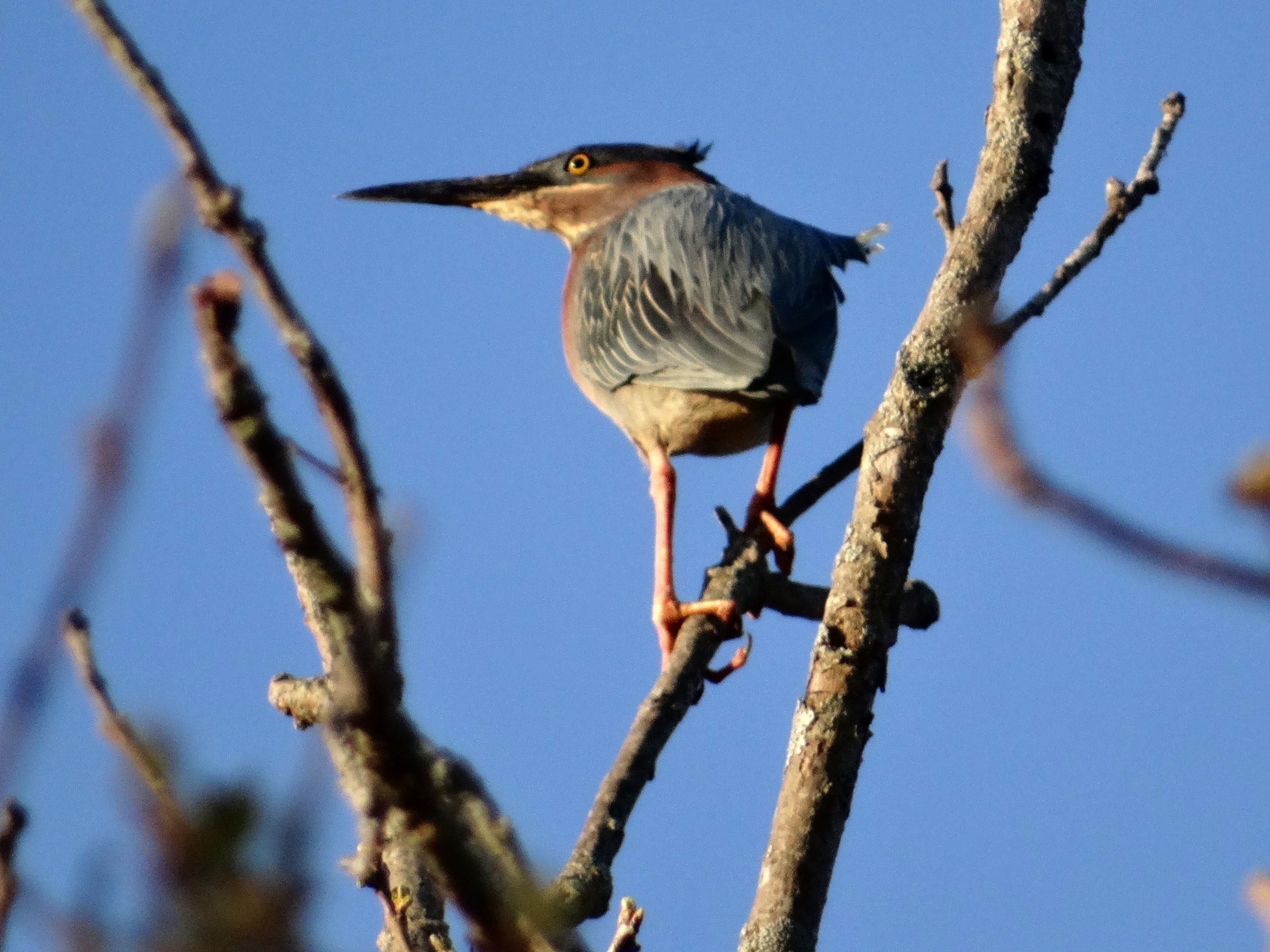 Short, stocky birds, the green heron resembles a bittern more than a heron. I’m not sure why it was sitting in a tree, over 30 feet high, when its preferred habitat is marshy land. Perhaps it was trying to get away from the annoying woman with the camera!
