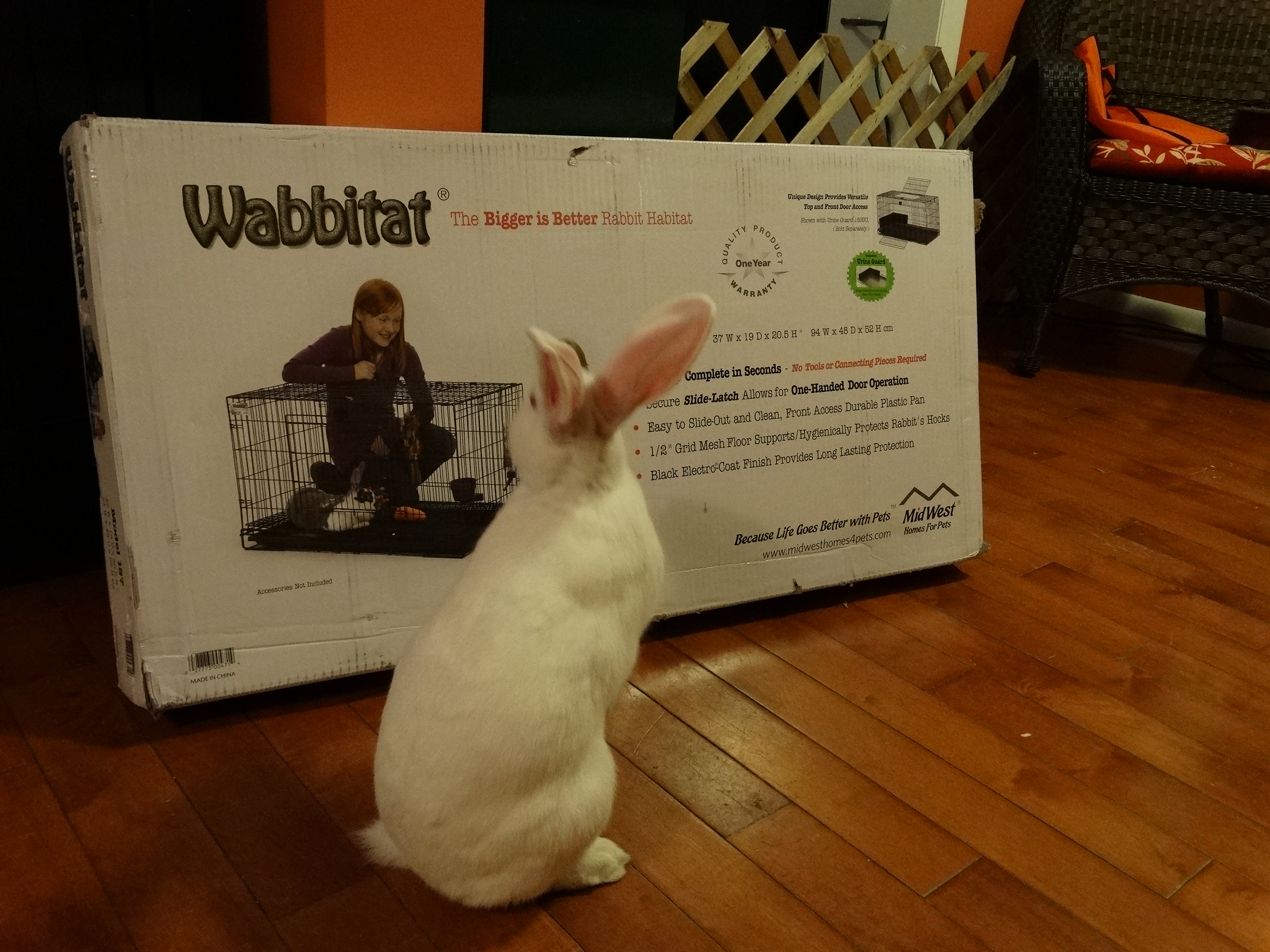 After some searching on the web, I settled on the Wabbitat! “The Bigger is Better Rabbit Habitat.” According to the box “Sets up complete in seconds!” Hmmm, if they were referring to 1220 seconds, then, damn, the box was right.