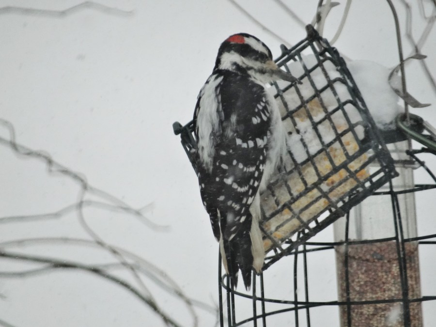 Male hairy woodpecker (hairy woodpeckers are about double the size of a downy woodpecker). Like the downy woodpecker, male hairy woodpeckers have a red patch.