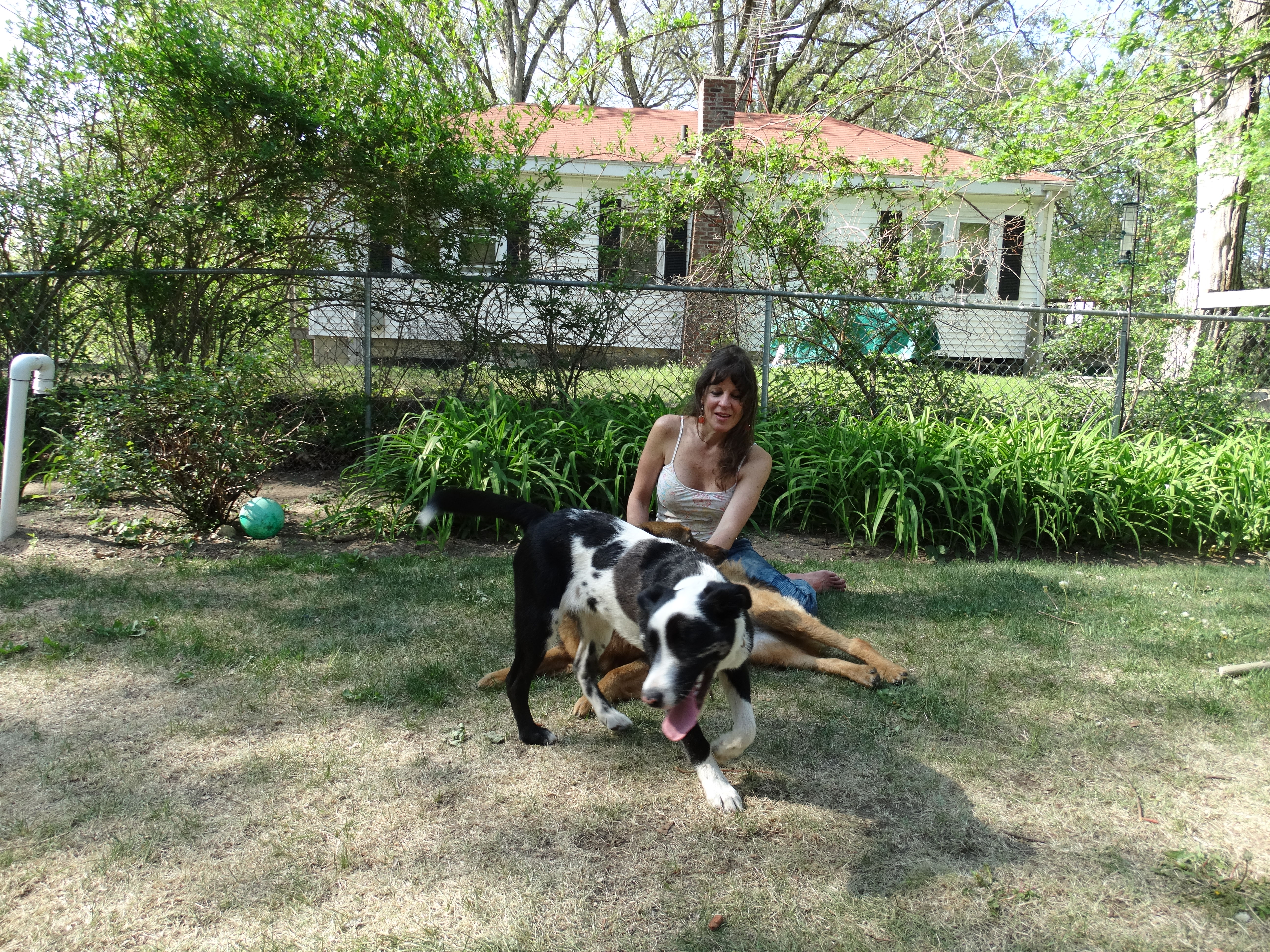 Penny wasn’t in the mood to be chased by two energetic dogs, so she watched from behind Sparky’s dogwood tree.