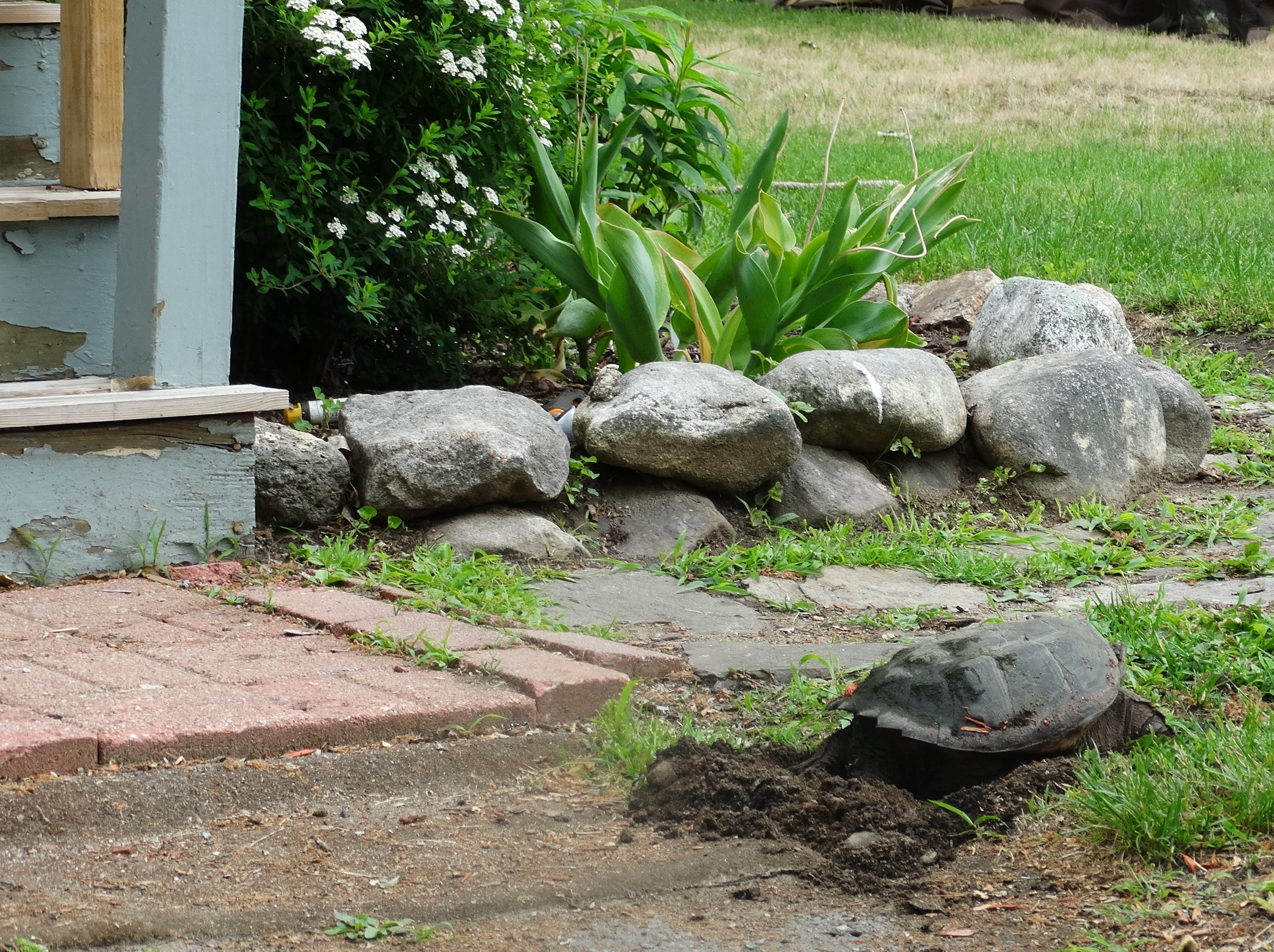 Saturday morning a rather large snapping turtle decided to lay her eggs at the bottom of my back steps. After digging up most of my new garden first (“Ahhhh, too soft, too hard, Ohhhh, this is just right!”), the most logical place seemed to be where I tend to walk. No problem!