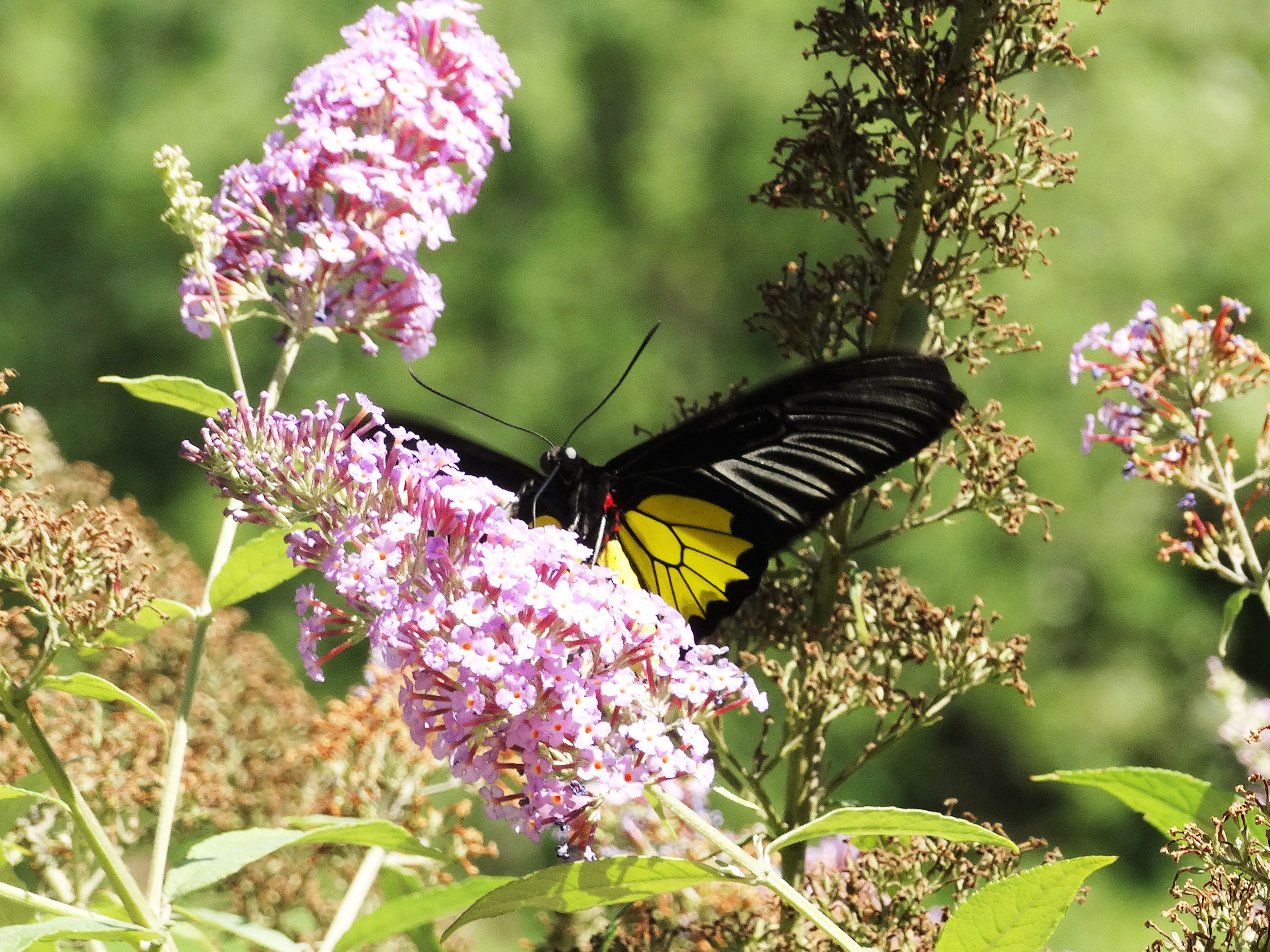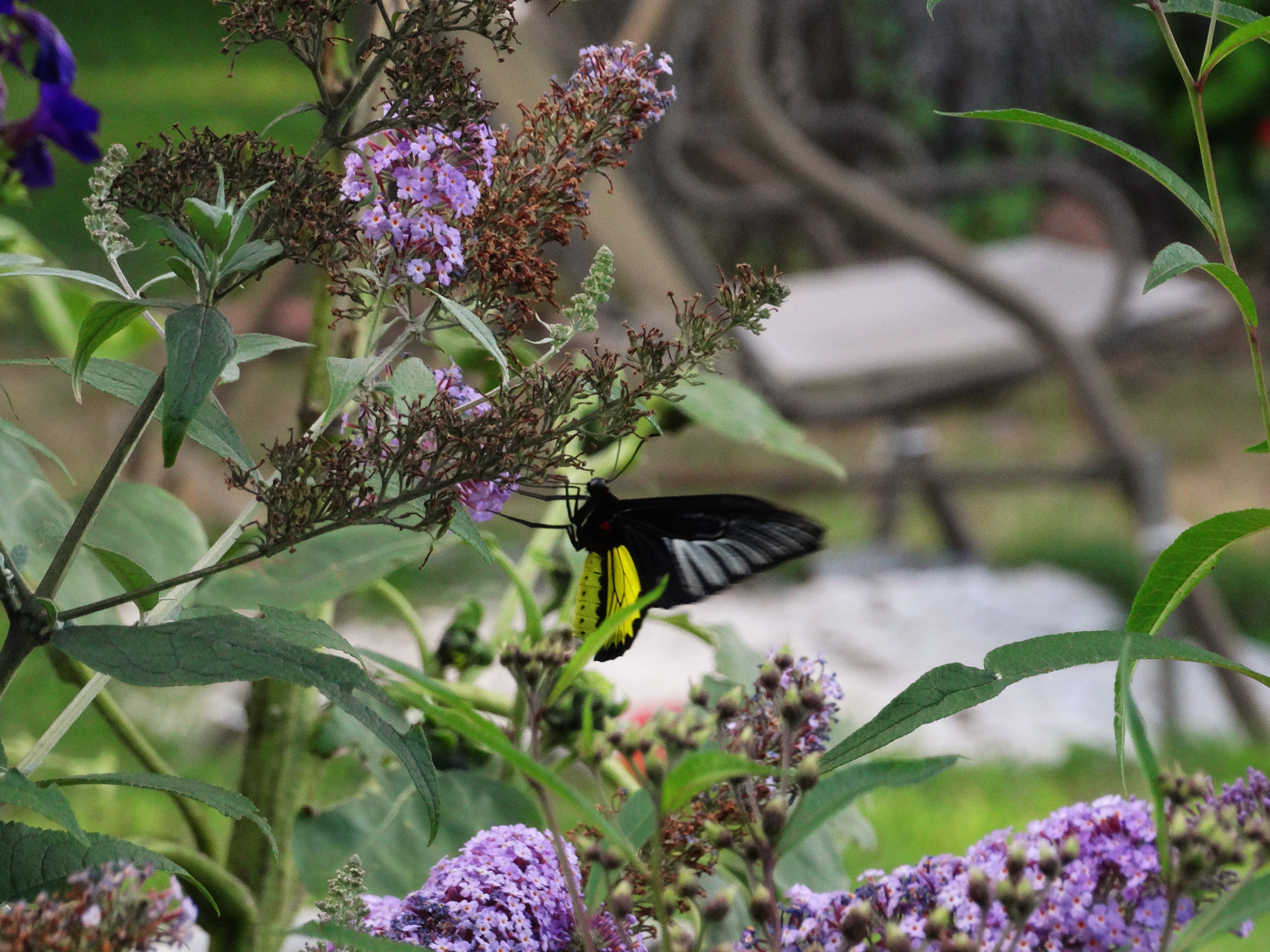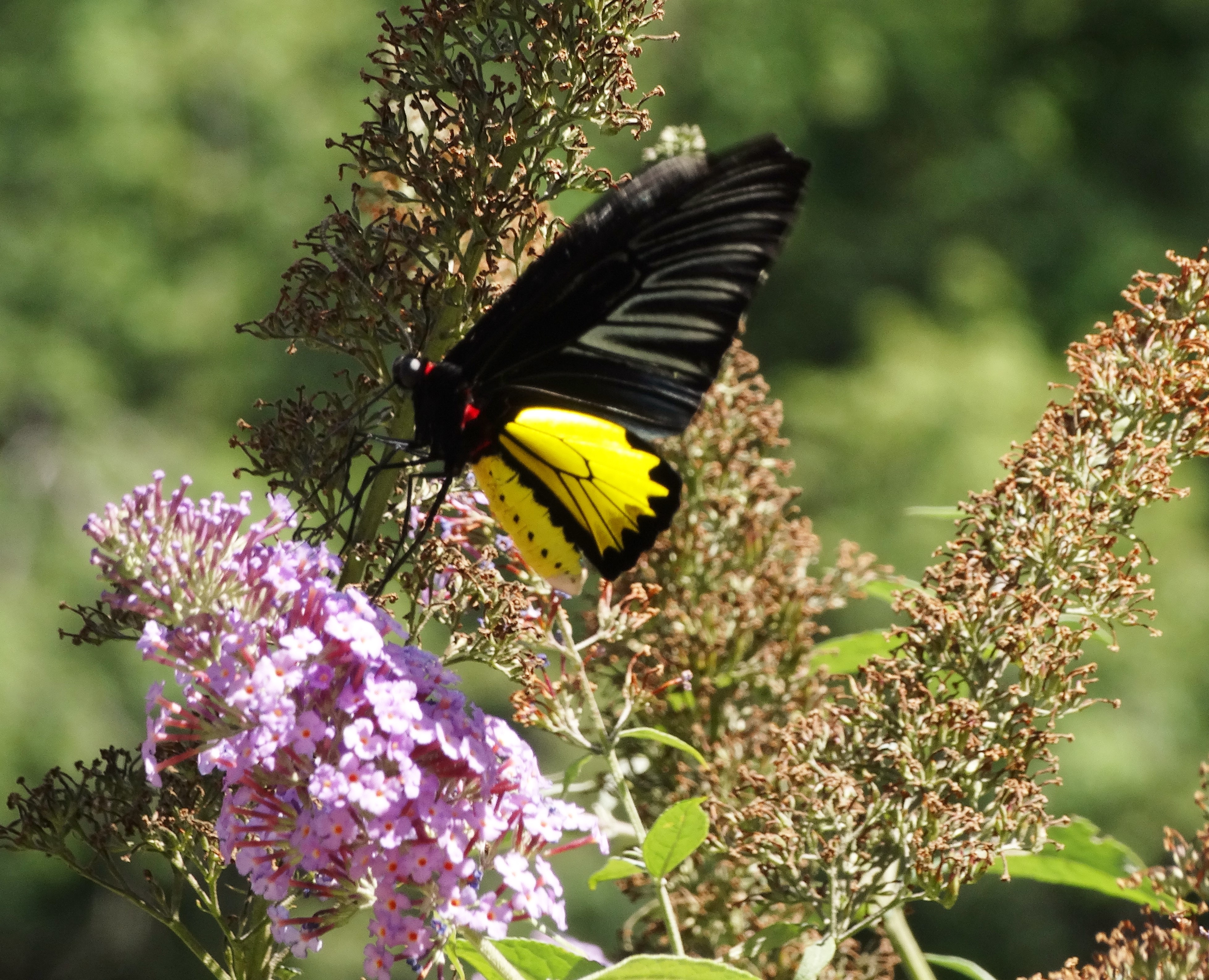 Since I’m sure he didn’t hop a trans-continental flight to the States, the only explanation that makes sense is he escaped from the Butterfly Place in Westford, MA. Birdwings are listed as one of the types of butterflies they house. Perhaps somebody left a window open or something. Or maybe he heard about the sumptuous nectar available at my little corner of the river, and he decided to take a field trip.