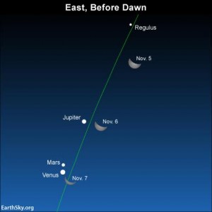 Not one to be outdone, the moon has now entered the picture, wanting to sharing an intimate moment with Jupiter, which should happen tomorrow morning.
