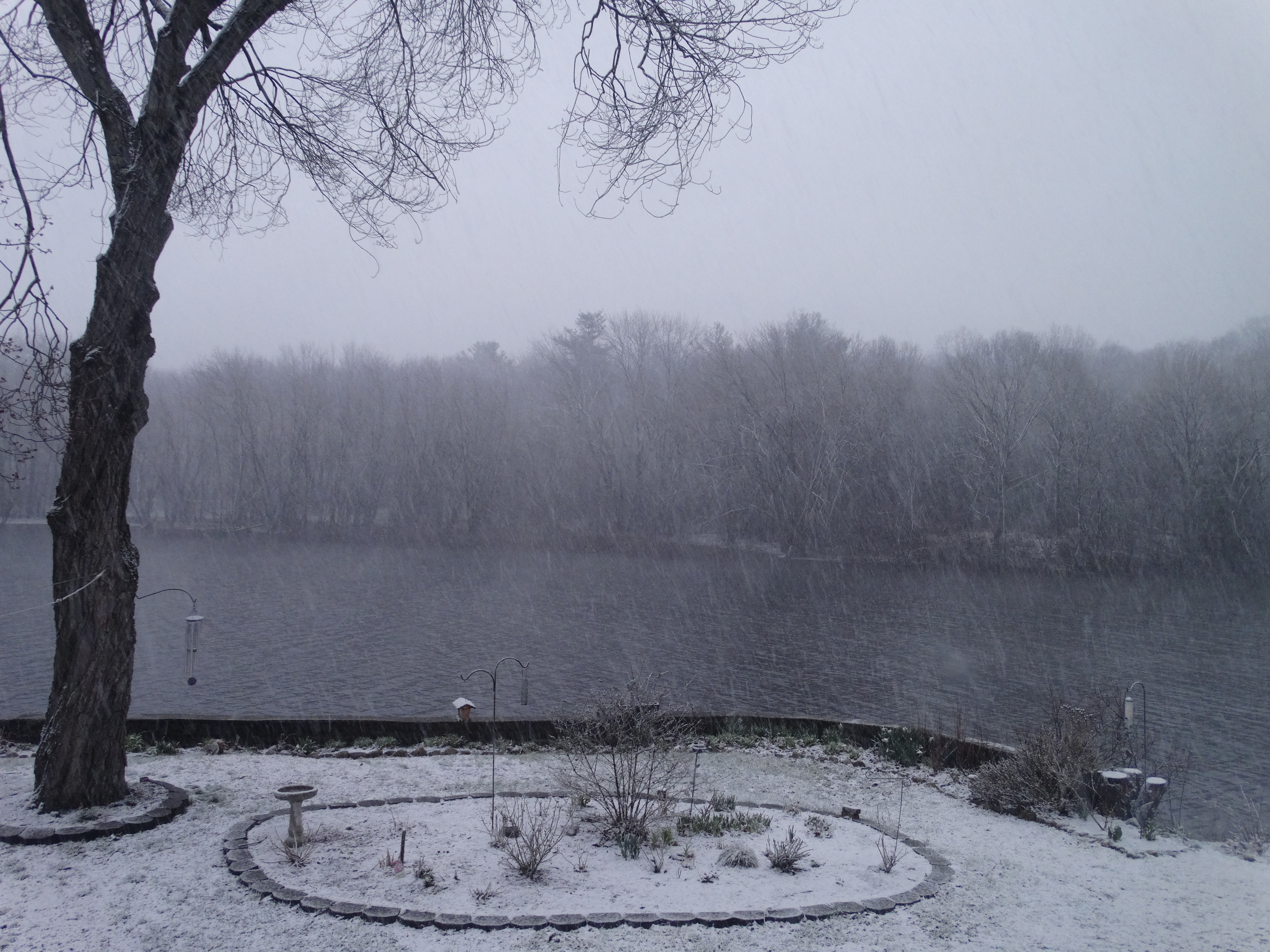 Today is April 3 and there’s snow falling on the Concord River. Mom Nature you certainly keep me guessing. You couldn’t do this before I uncovered all my plants. Now they’re blanketed in white and probably shivering to beat the band. Oh well, I’m sure you know what you’re doing.