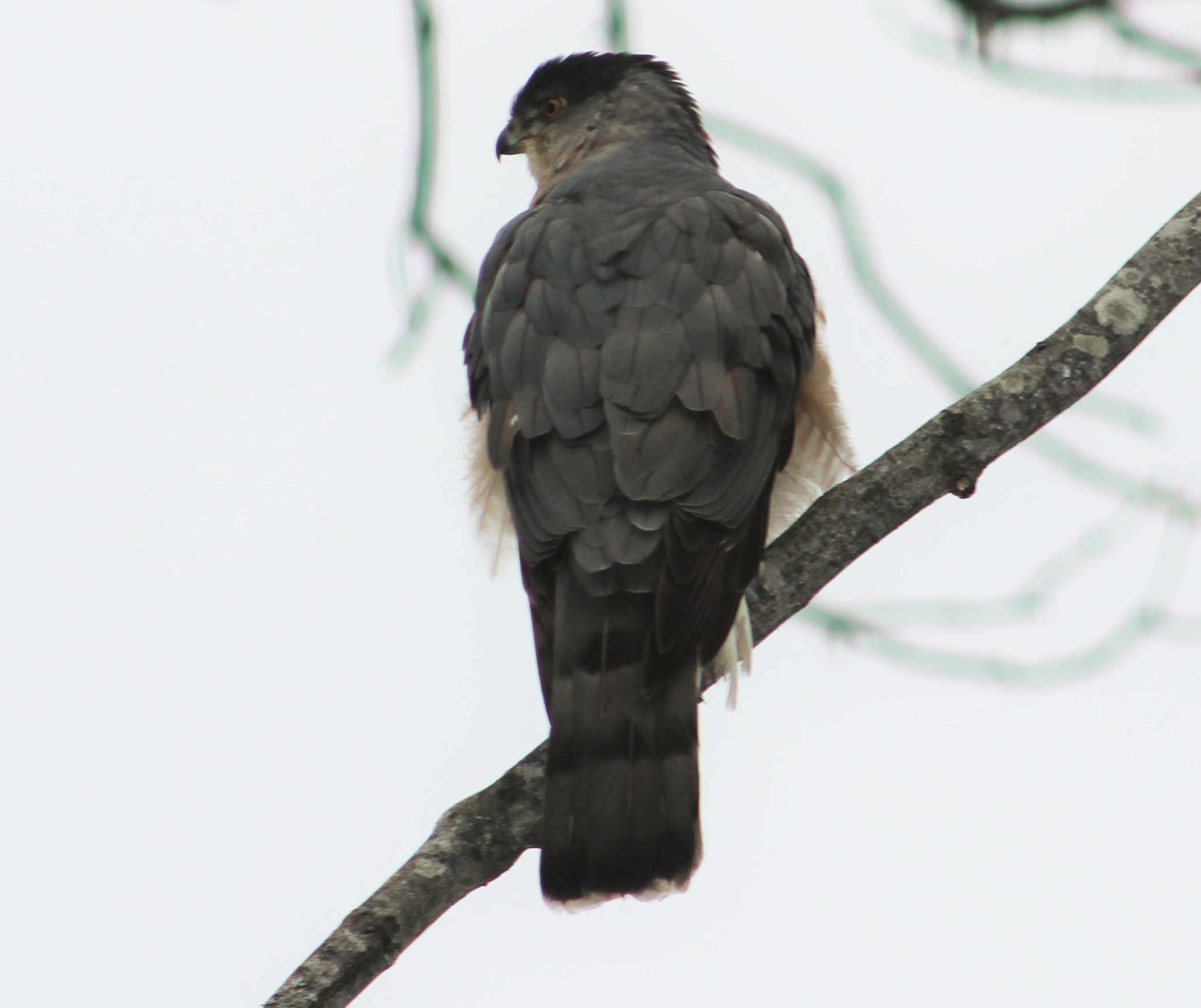 The shape of the tail eliminates Cooper’s hawk and leads me to believe its a sharp-shinned hawk. Either way, its talons are designed to grab and its beak built to rip. Last summer I watched a hawk grab a drake from the water, lift it about thirty feet into the air then drop it. The poor thing landed with a plop, quack, then flew off toward Lowell.