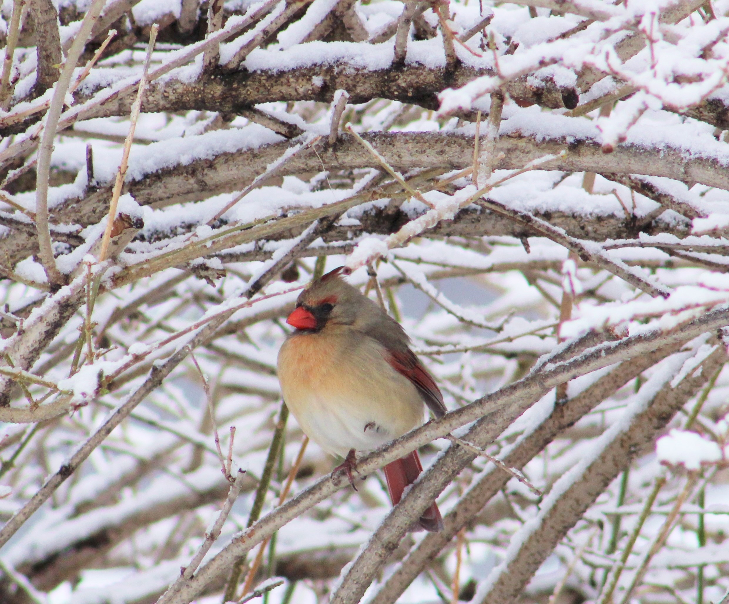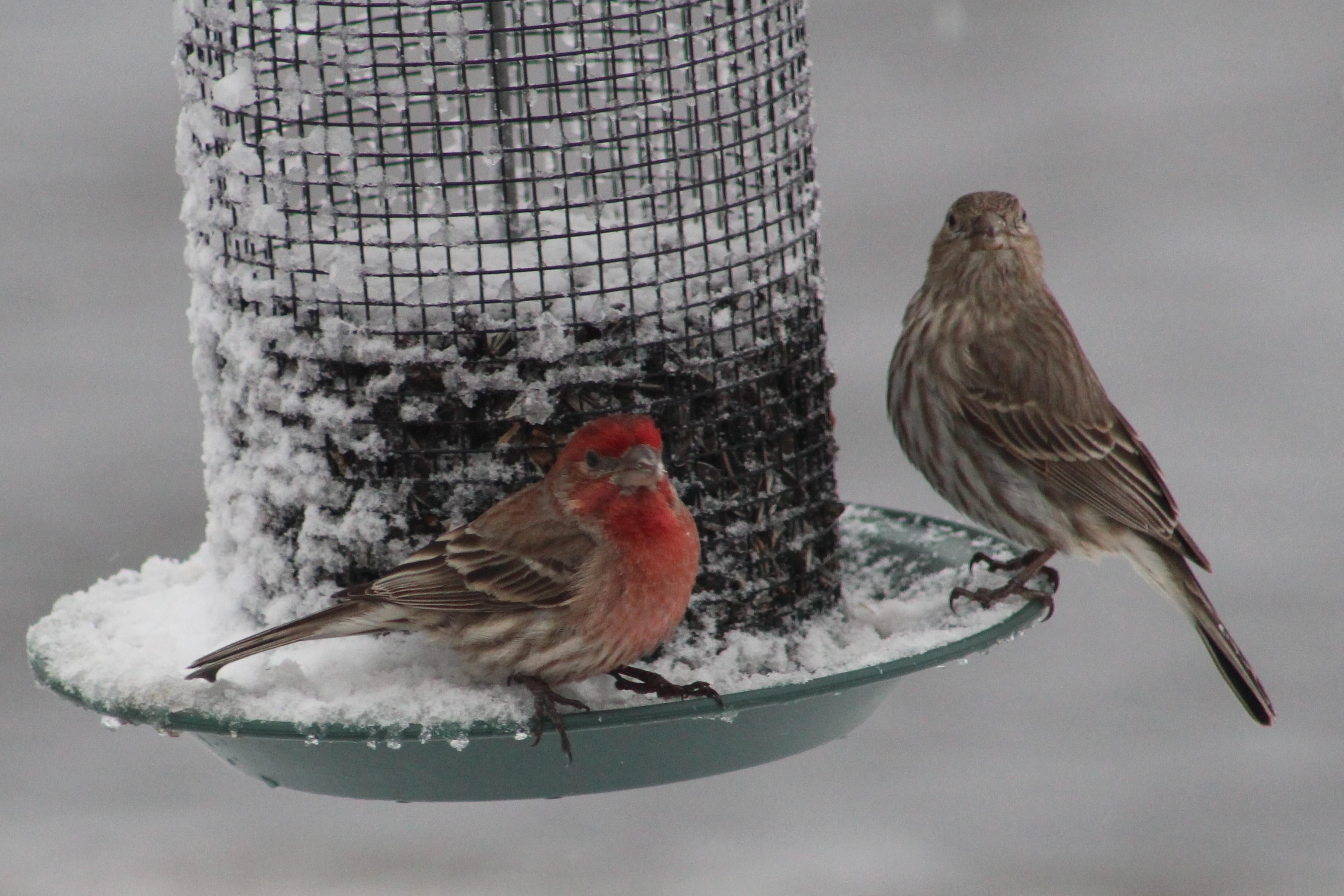 This is the second time I’ve witnessed the Northern cardinal’s bonding ritual. The male cracks a sunflower seed then feeds the meat to the female. In essence he’s saying, “Be mine. I will protect you and your eggs.” Or he might be saying, “Meet me behind the large oak. I’ve have handcuffs and a whip.” One never knows these days.