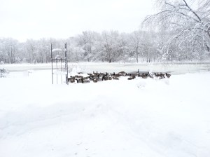My ducks are a hardy lot, though. They braved the sleet, snow, and biting temperatures. My beach was blanketed in a marshmallow coating of white, with an island of brown.