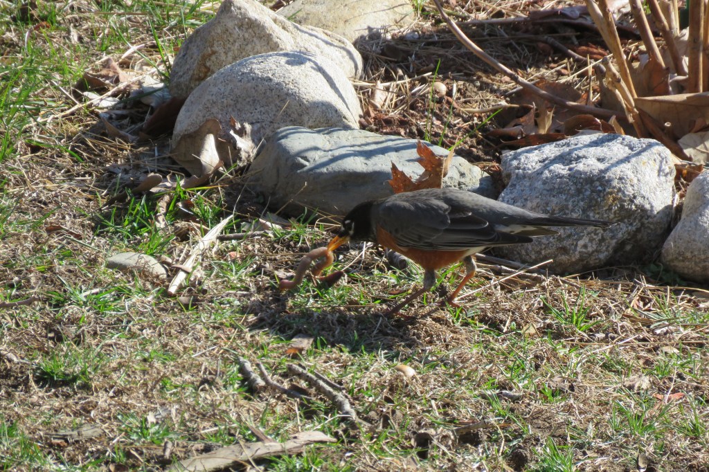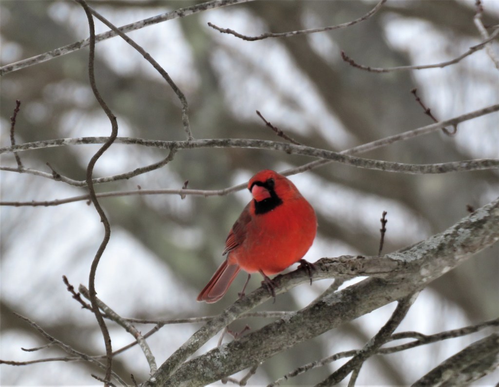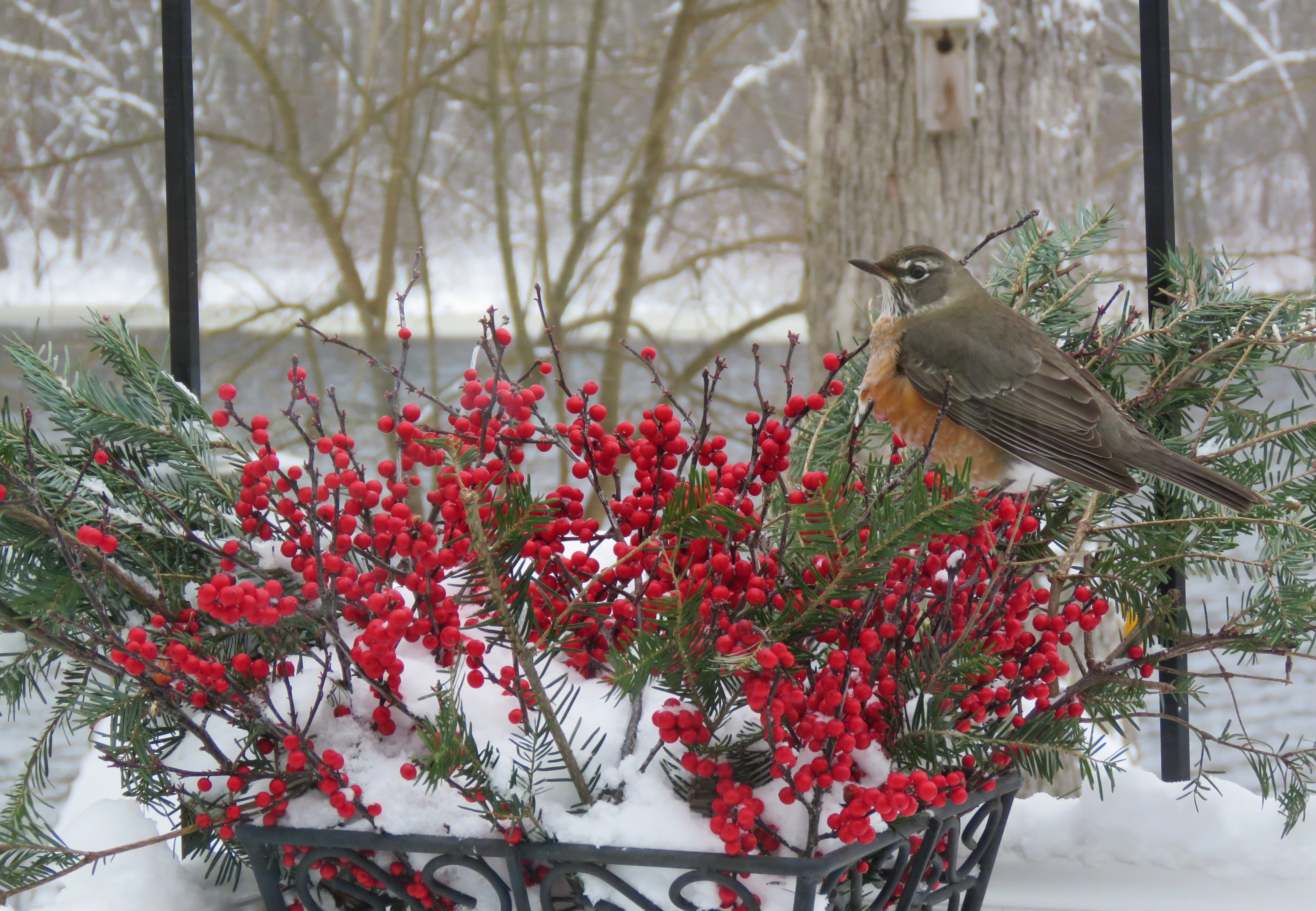 Clockwise, starting with the upper left photo: American robin, American robin on the winterberries, female Downy woodpecker, female Hairy woodpecker, Mourning dove, Blue-jay, and, last but not least, male Northern cardinal (below).