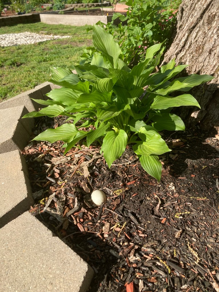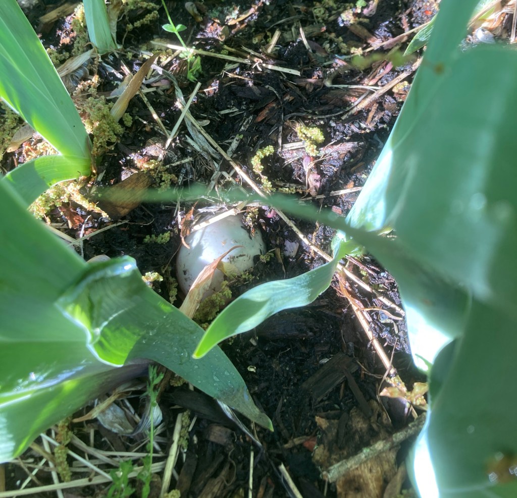A second blessing and this egg joined its brother/sister in the river. I returned to my gardening duties when in my Bearded Iris bed I spied…