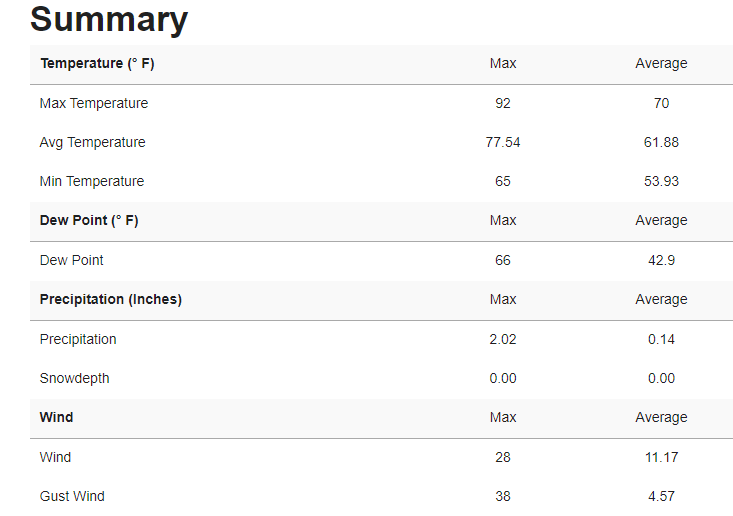 While you’re studying the above data table (There will be a test at the end of this post.) check out the wind gusts. A typical breeze for my area is between 4 and 5 MPH, but noooooo, we’re getting close to 40 MPH. That’s a BIG difference.