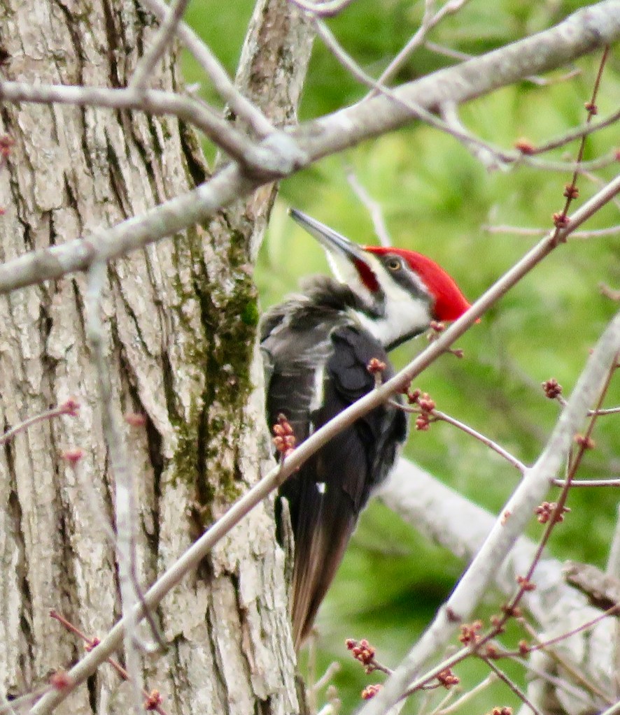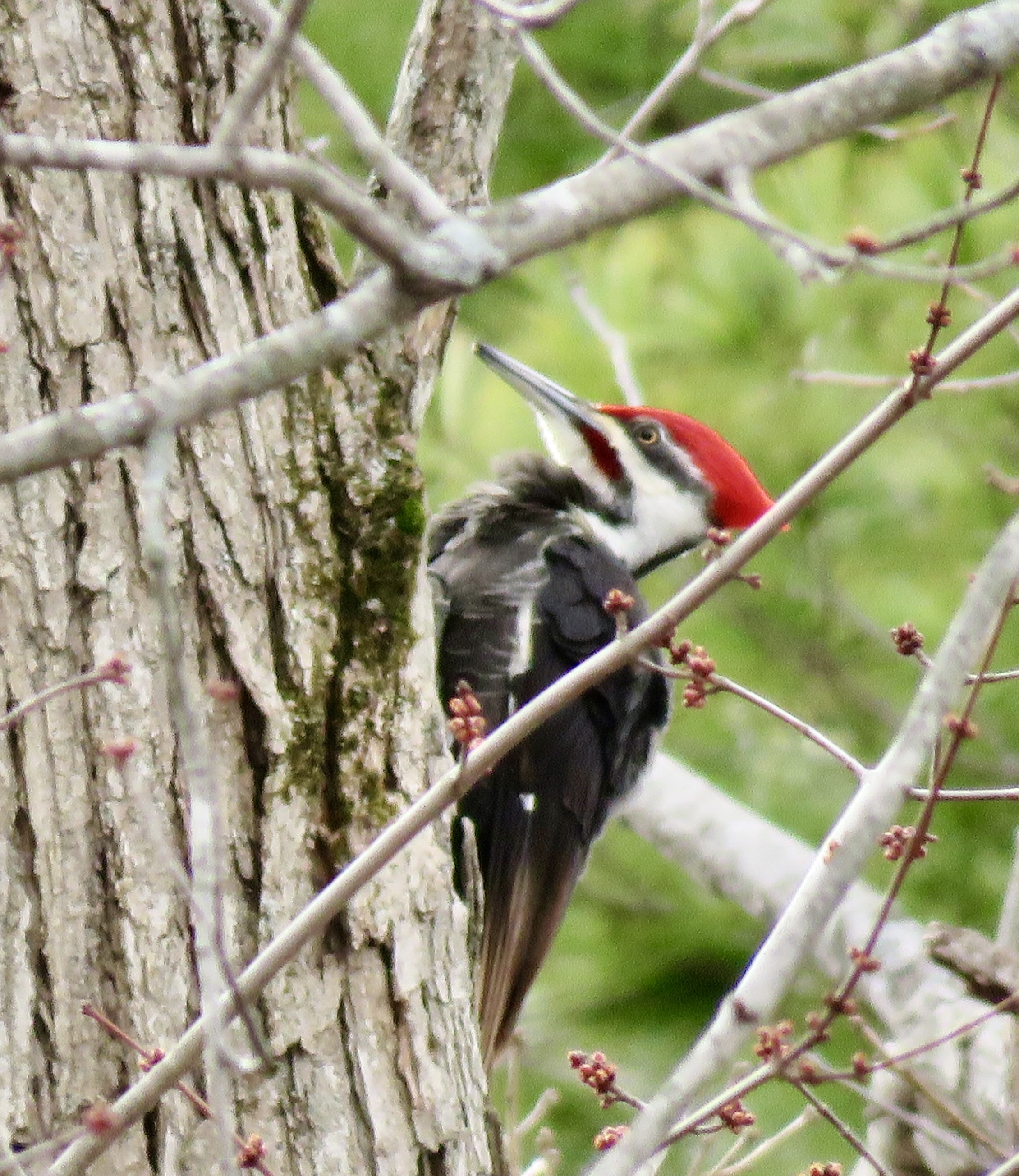 I know it’s not the best picture, give me a break; he was up in a very tall tree (30 feet or so) and my hands were shaking (not from excitement but because I had been raking for a couple of hours). Who cares, right? I got a picture and he stayed around for a bit, showing off his dope red feather cap.