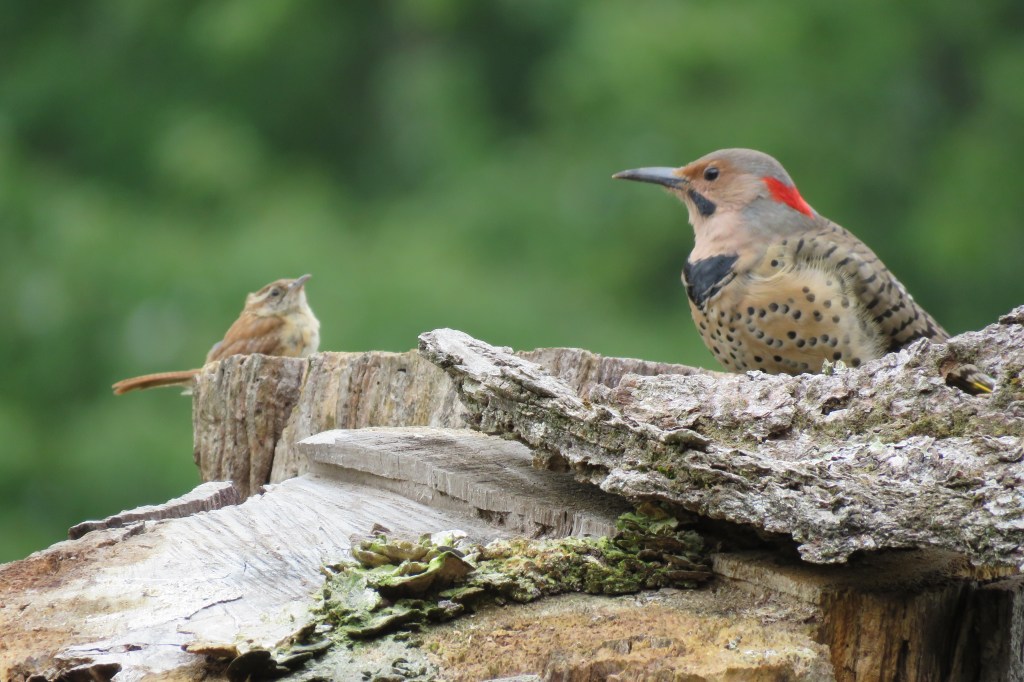 And a Common Flicker and Carolina Wren shared the high perch in search of delicious insects.